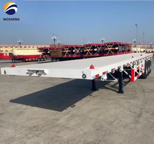 1평면 컨테이너 트레일러는 우리 회사의 주요 제품입니다. 그것은 높은 강도 전체 두께의 강철, 티타늄 함유 0.98‰,빔과 프레임의 강도와 강도를 보장합니다.최대 로딩 용량:20~100 톤
